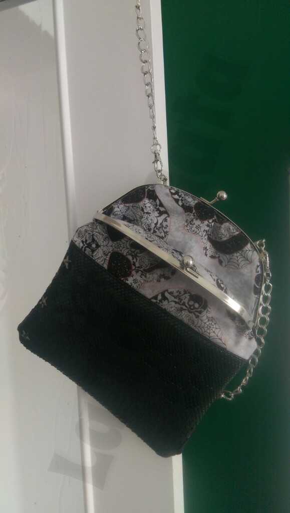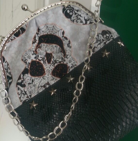 Es mezcla de calavera y polipiel negra, tiene boquilla y cadena plateada para lograr un bolso único como ella.
