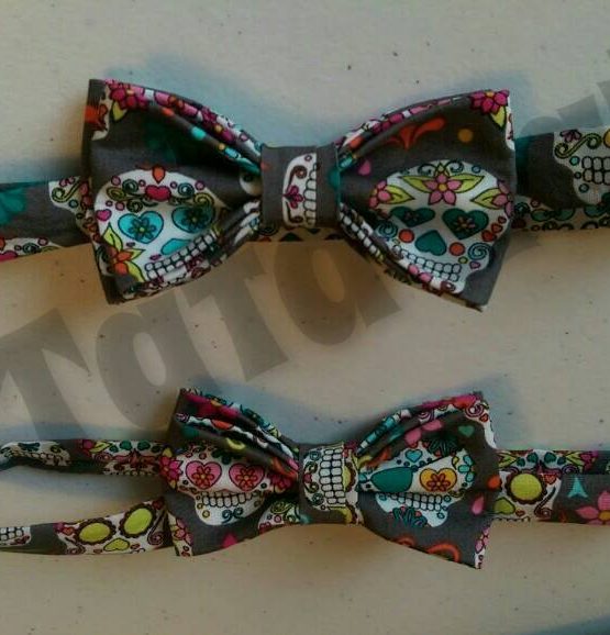 Ellos llevaban trajes azules y les molestarían las corbatas, así que como tenía una tela de catrinas de colores en fondo gris que le iba perfecto al azul, le recomendé unas pajaritas para los pajaretes.