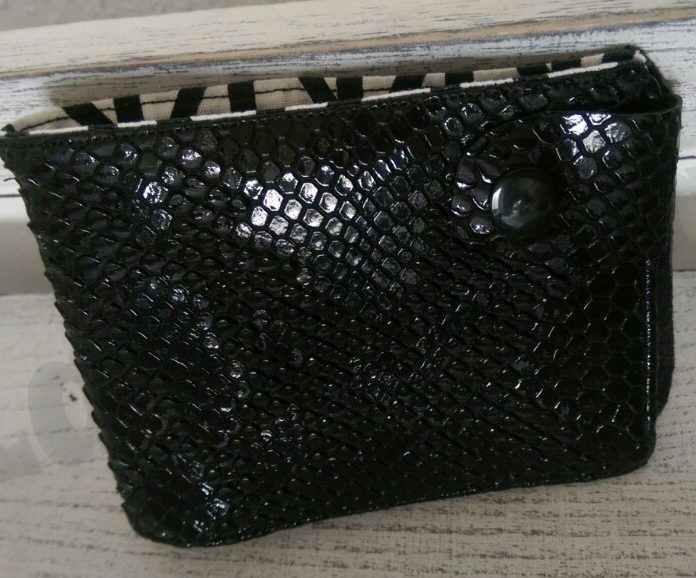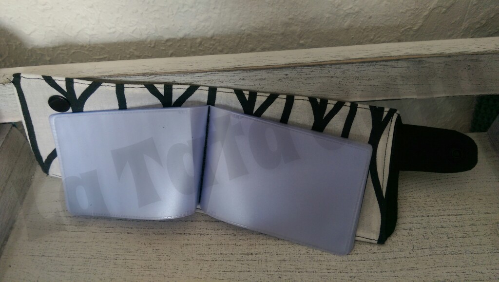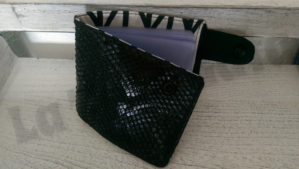 Me lo encargó de Polipiel negra con interior de algodón y tarjeteros de plástico para protegerlas.